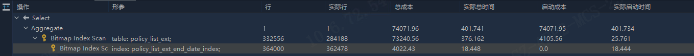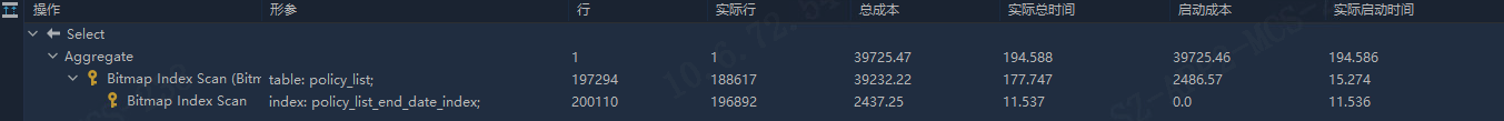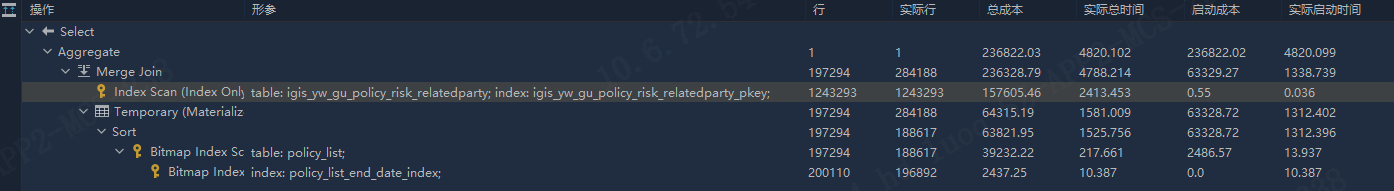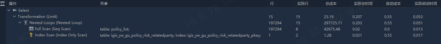由于一个保单只会有一个被保人 而policy_list是以标的纬度为主,所以是policy_list中同一个保单多个标的会对应一个igis_yw_gu_policy_relatedparty表里的数据。最终执行时间:359ms 执行计划如下: